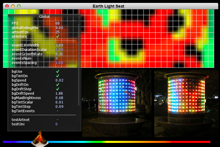 EARTH LIGHT SEAT was a seismically responsive RGB LED lighting instrument triggered by global seismic data from Mw 0.1+ reported via